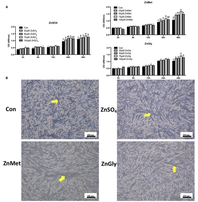 FIGURE 1 | CCK-8 (A) in cell proliferation and morphological responses incell differentiation (B) of C2C12 cell line by adding different zinc sources.