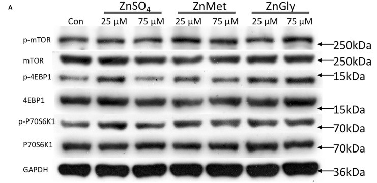 FIGURE2 The protein expression levels of phosphorylated mTOR, 4EBP1, and P70S6K1 wereall up-regulated in myotubes after treatment with 25μM ZnMet (P < 0.05).